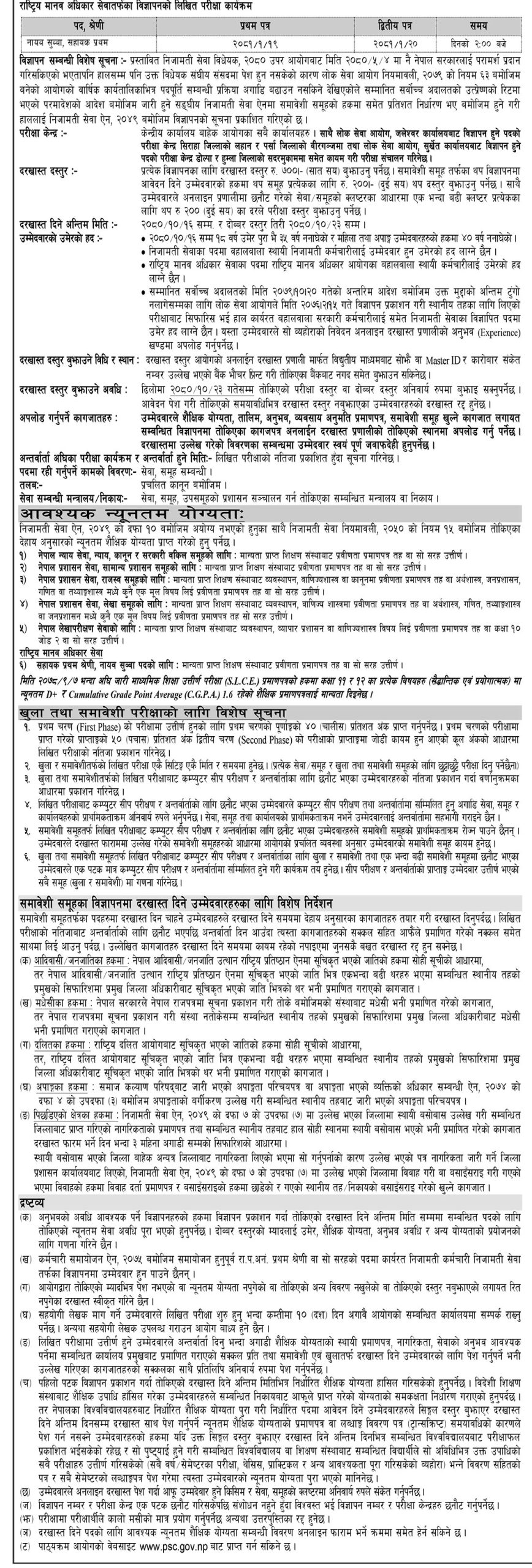 काठमाडौँ, २५ पुस । लोकसेवा आयोगले विभिन्न रिक्त पदपूर्तिका लागि आवेदन आह्वान गरेको छ । निजामती सेवाका राजपत्र अनङ्कित प्रथम श्रेणी (अप्राविधिक) तथा राष्ट्रिय मानव अधिकार सेवाका सहायक प्रथम श्रेणीका पदका लागि आयोगले दरखास्त माग गरेको हो ।