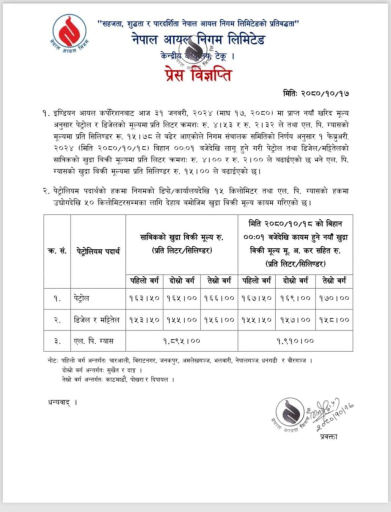 निगमले बिहीबार (माघ १८ गते) राति १२ बजेदेखि लागू हुने गरी इन्धनको मूल्य बढाएको हो ।