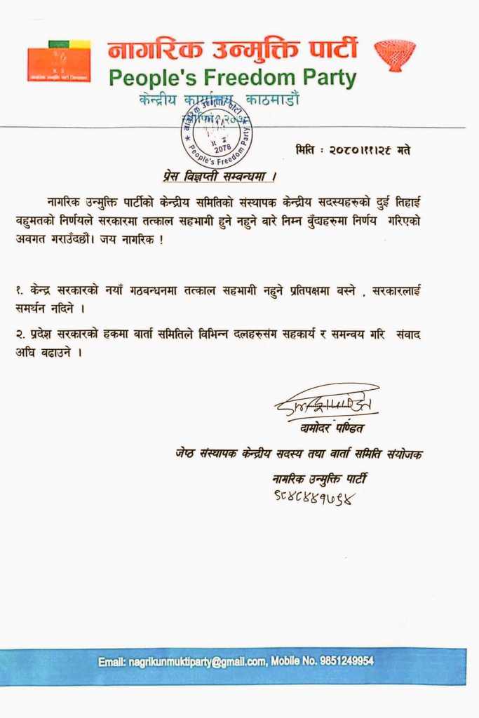 यता नागरिक उन्मुक्तिका ज्येष्ठ संस्थापक केन्द्रीय सदस्य एवं वार्ता टोलीका संयोजक दामोदर पण्डितले विज्ञप्ति प्रकाशित गरी अहिले पार्टी सङ्घीय सरकारमा नजाने र प्रतिपक्षमा बस्ने जनाएका छन्।