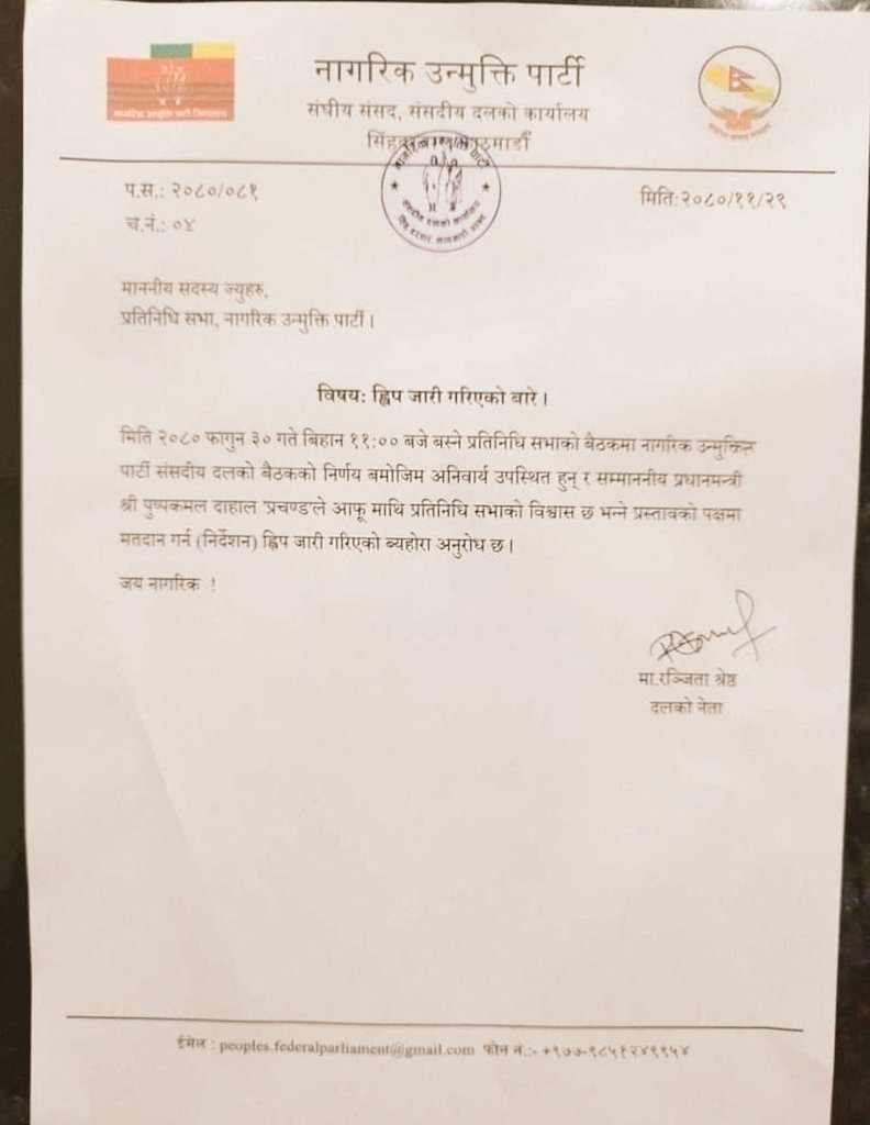 नागरिक उन्मुक्ति पार्टीका अध्यक्ष तथा संसदीय दलको नेता रञ्जिता श्रेष्ठले जारी गरेको ह्विपमा भनिएको छ, ‘मिति २०८० फागुन ३० गते बिहान ११:०० बजे बस्ने प्रतिनिधि सभाको बैठकमा नागरिक उन्मुक्ति पार्टी संसदीय दलको बैठकको निर्णयबमोजिम अनिवार्य उपस्थित हुन र सम्माननीय प्रधानमन्त्री श्री पुष्पकमल दाहाल ‘प्रचण्ड’ले आफूमाथि प्रतिनिधि सभाको विश्वास छ भन्ने प्रस्तावको पक्षमा मतदान गर्न निर्देशन छ।’
