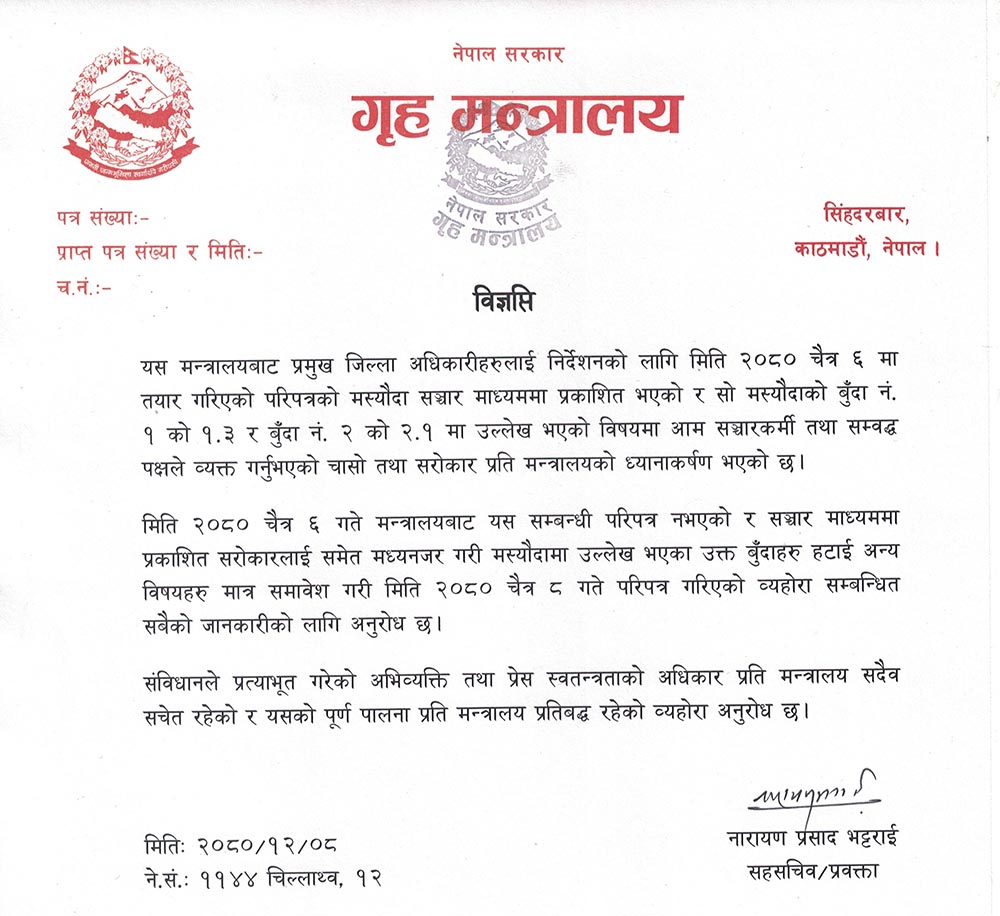 गृह मन्त्रालयले बिहीबार यसअघि चैत्र ६ मा तयार गरिएको परिपत्रको मस्यौदालाई सच्याएर परिपत्र गरिएको जानकारी दिएको छ ।