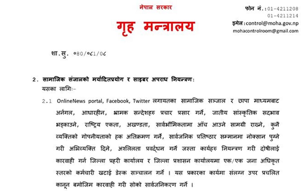 यसअघि पठाइएको २१ बुँदे निर्देशनको दुई नम्बर बुँदामा सामाजिक सञ्जालको मर्यादित प्रयोग र साइबर अपराध नियन्त्रण सम्बन्धी उल्लेख गर्दै त्यसमा अनलाइन न्युज पोर्टल समेत उल्लेख गरिएको थियो ।