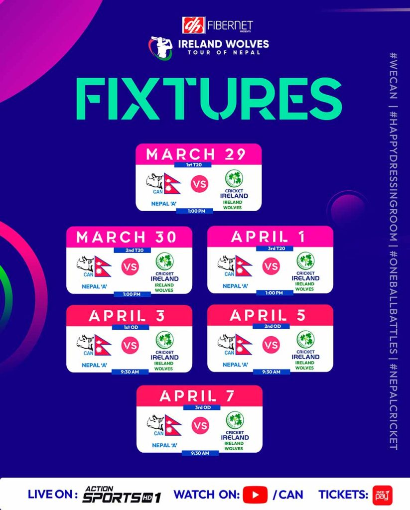 नयाँ तालिका अनुसार अब नेपाल ए ले मार्च २९, ३० र अप्रिल १ मा आयरल्यान्ड वोल्भ्ससँग टी-२० सिरिज र अप्रिल ३, ५ र ७ मा एक दिवसीय सिरिजका खेल्ने तालिका रहेको छ ।
